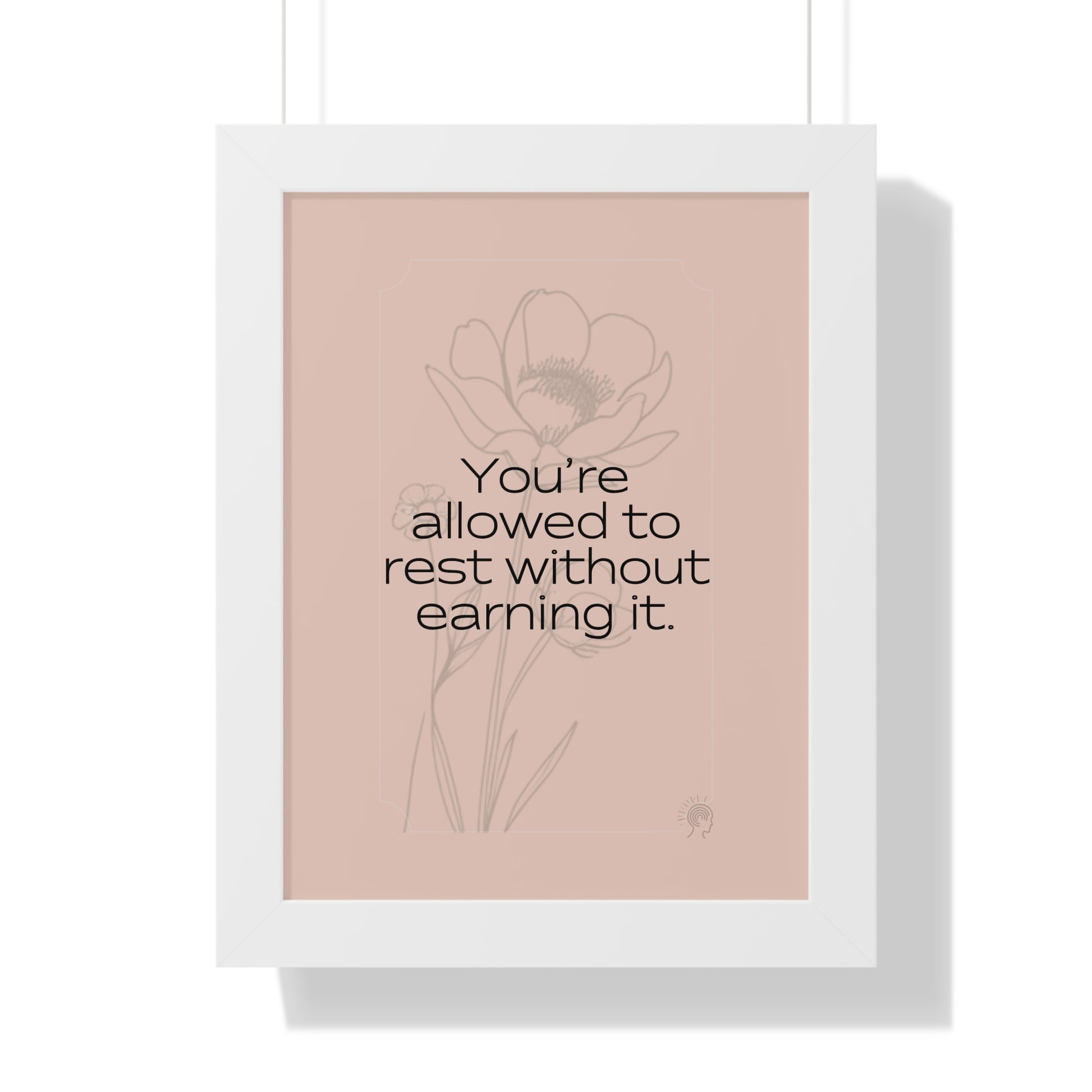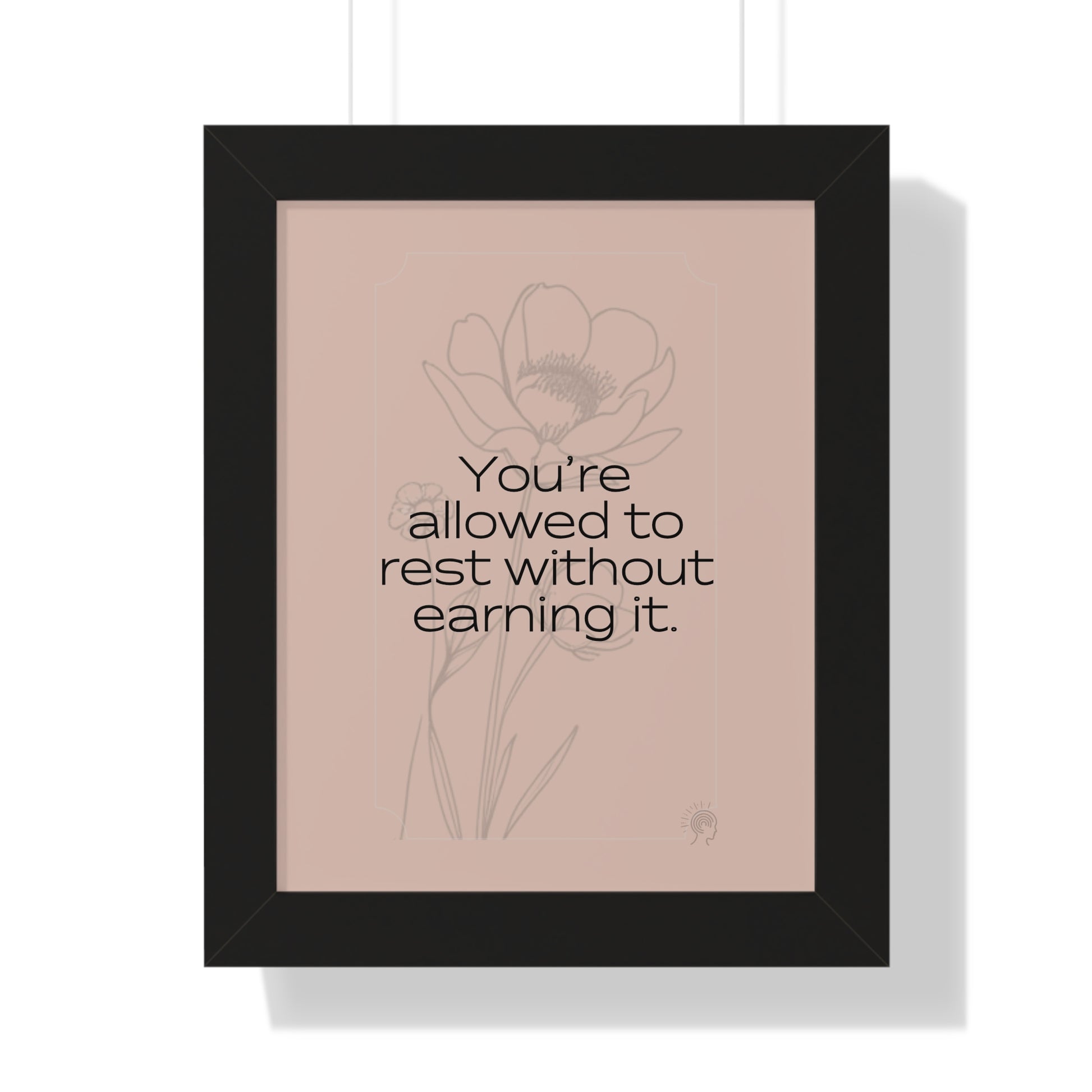 Elevate the ambiance of any room with this elegant framed vertical poster. Designed to inspire and motivate, the gentle reminder that "You're allowed to rest without earning it." resonates deeply, making it a perfect addition to your home or office.